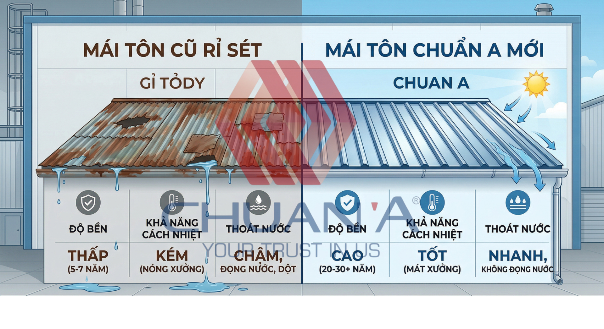 Sự thay đổi nhiệt độ đột ngột (giữa trưa nắng 40°C và mưa rào 25°C) khiến tôn co giãn liên tục. Sau 10-15 năm, các tấm tôn bị "mỏi", xuất hiện tình trạng cong vênh, hở mối nối. Đây là con đường ngắn nhất để gió bão thổi bay cả mái nhà hoặc nước tạt ngang gây dột diện rộng.