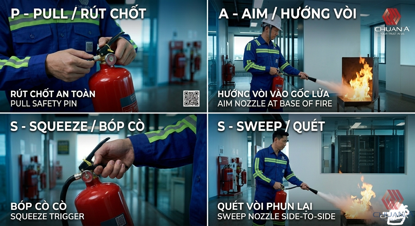 Cẩm nang chi tiết từ Công ty Chuẩn A về cách phân loại và sử dụng bình chữa cháy bột, khí CO2. Quy tắc PASS và những lưu ý sinh tồn quan trọng.